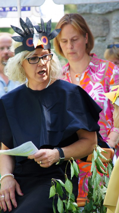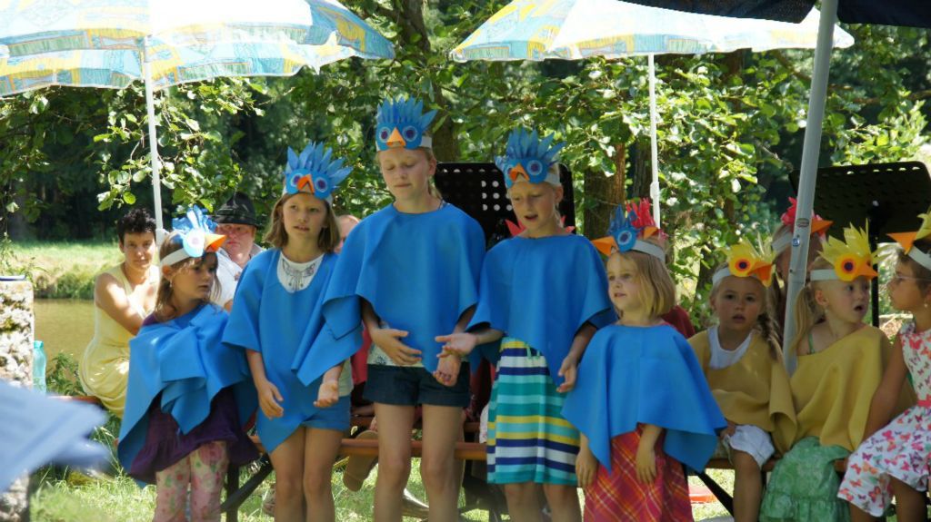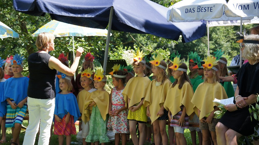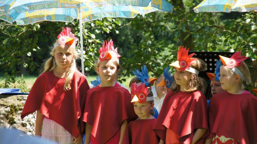 Höhepunkt aber war das Musical, das der Kinderchor unter der Leitung von Elisabeth Hohn aufführte. Die Seebachspatzen sangen und spielten die Geschichte von Nerino, einem kleinen Vogel, der darunter leidet, dass er nicht so schön bunt ist wieall die anderen Vögel. Als ein Vogelfänger allerdings alle bunten Vögel einfängt, schlägt Nerinos große Stunde. Er kann - als einziger unentdeckt - die anderen Vögel befreien. Nerino erkennt dadurch, dass "Anders-Sein" auch Vorteile haben kann.